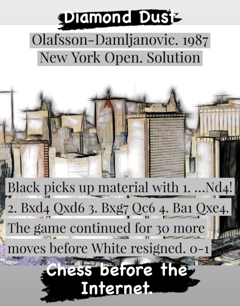 Diamond Dust Posted byformermailmanJune 13, 2023Posted inTacticsTags:Chess combinations, Chess problems, Chess tactics, Tactics Share this: Click to share on X (Opens in new window) X Click to share on Facebook (Opens in new window) Facebook Click to share on LinkedIn (Opens in new window) LinkedIn Like Loading... Related