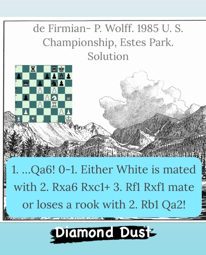 Diamond Dust Posted byformermailmanAugust 9, 2023Posted inTacticsTags:Chess combinations, Chess problems, Chess tactics, Tactics Share this: Click to share on X (Opens in new window) X Click to share on Facebook (Opens in new window) Facebook Click to share on LinkedIn (Opens in new window) LinkedIn Like Loading... Related