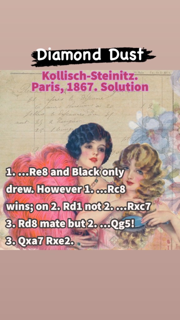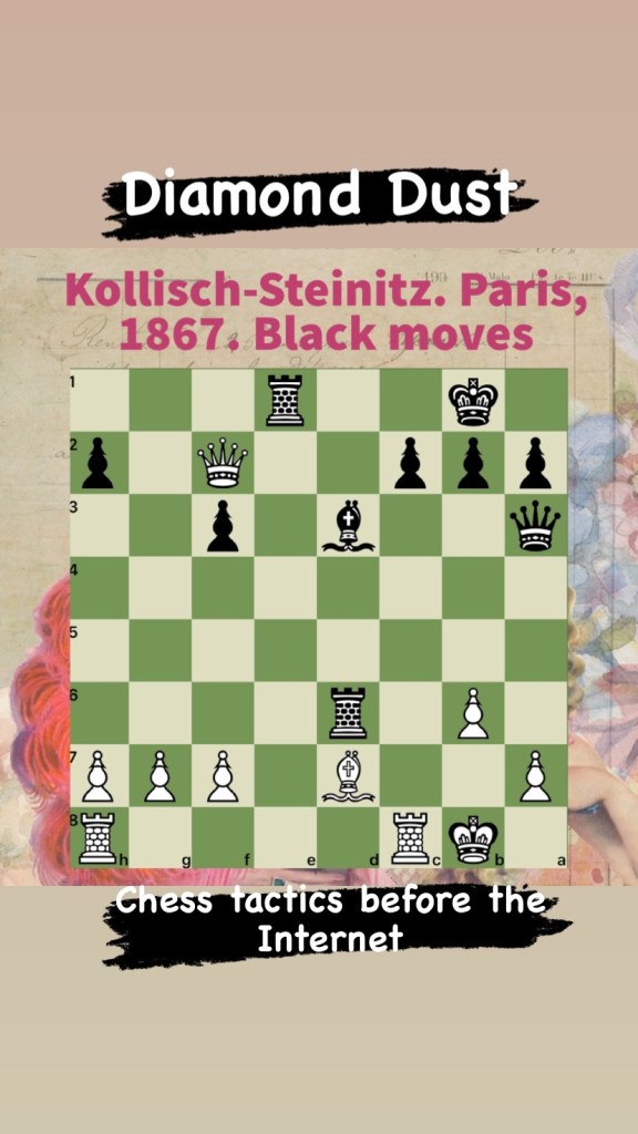 Diamond Dust Posted byformermailmanSeptember 24, 2023Posted inTacticsTags:Chess combinations, Chess problems, Chess tactics, Tactics Share this: Click to share on X (Opens in new window) X Click to share on Facebook (Opens in new window) Facebook Click to share on LinkedIn (Opens in new window) LinkedIn Like Loading... Related