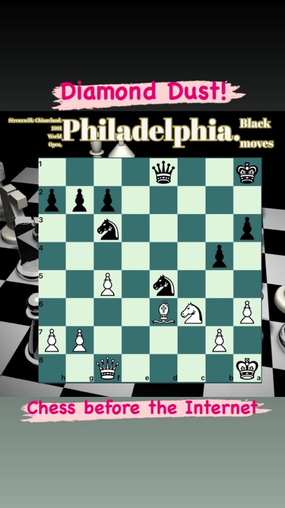 Diamond Dust Posted byformermailmanSeptember 30, 2023Posted inTacticsTags:Chess combinations, Chess problems, Chess tactics, Tactics Share this: Click to share on X (Opens in new window) X Click to share on Facebook (Opens in new window) Facebook Click to share on LinkedIn (Opens in new window) LinkedIn Like Loading... Related