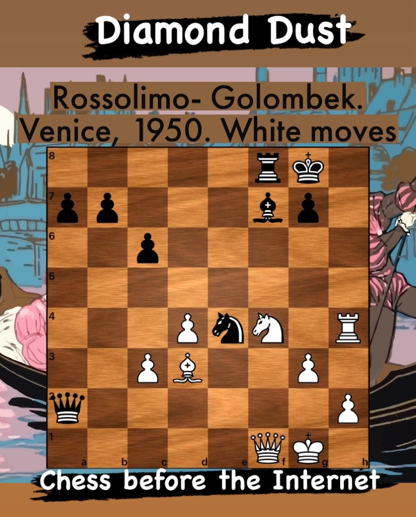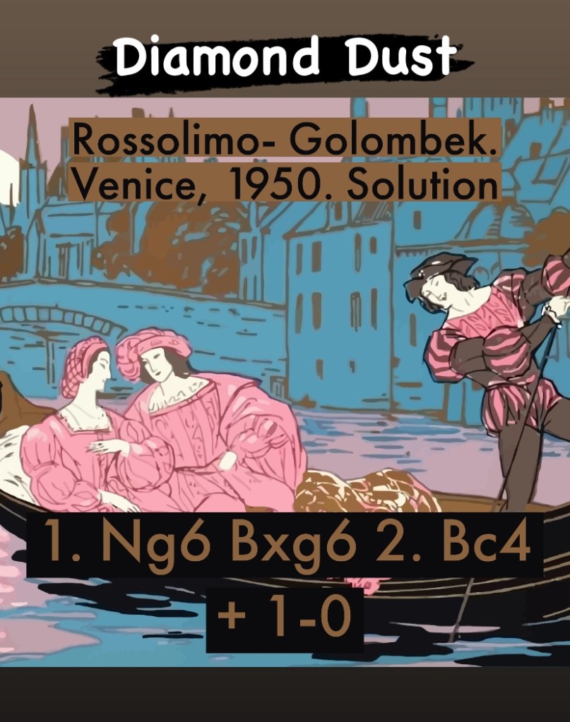 Diamond Dust Posted byformermailmanNovember 16, 2023Posted inTacticsTags:Chess combinations, Chess problems, Chess tactics, Tactics Share this: Click to share on X (Opens in new window) X Click to share on Facebook (Opens in new window) Facebook Click to share on LinkedIn (Opens in new window) LinkedIn Like Loading... Related