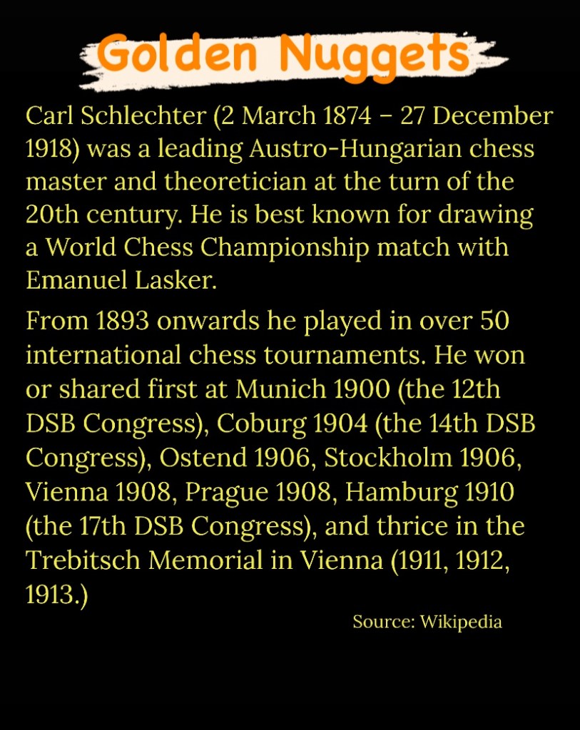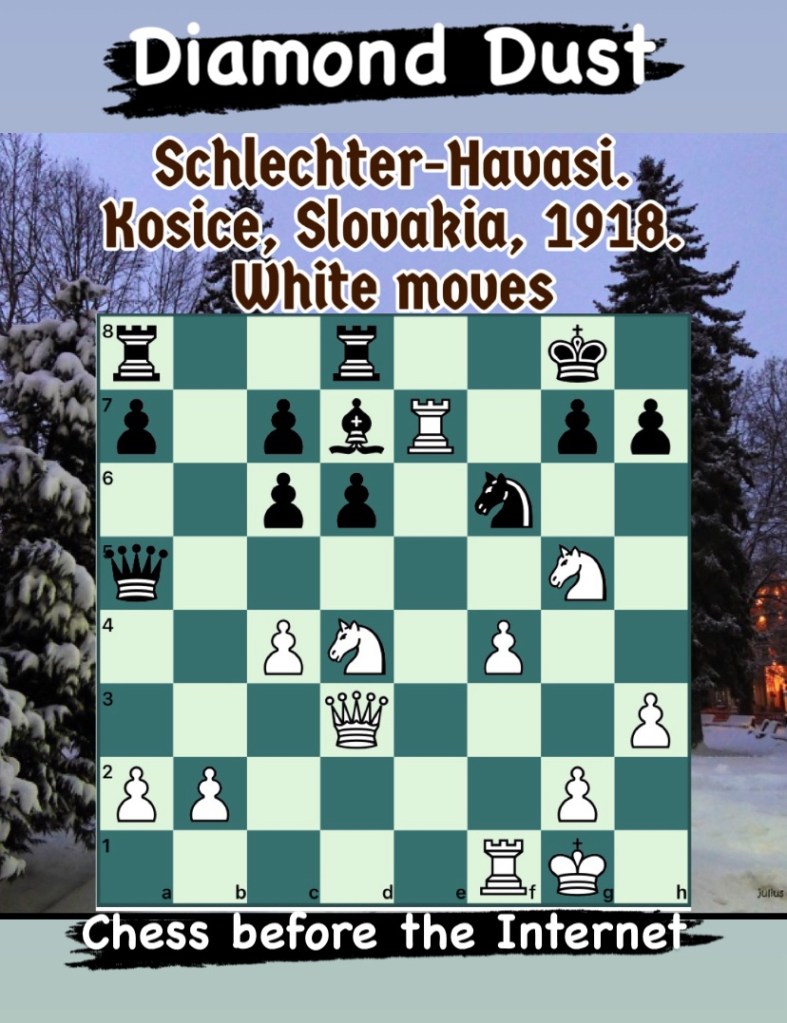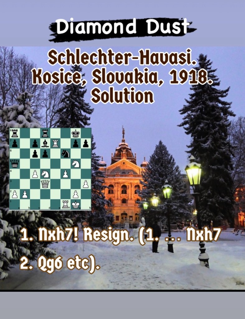 Diamond Dust Posted byformermailmanNovember 27, 2023Posted inTacticsTags:Chess combinations, Chess problems, Chess tactics, Tactics Share this: Click to share on X (Opens in new window) X Click to share on Facebook (Opens in new window) Facebook Click to share on LinkedIn (Opens in new window) LinkedIn Like Loading... Related
