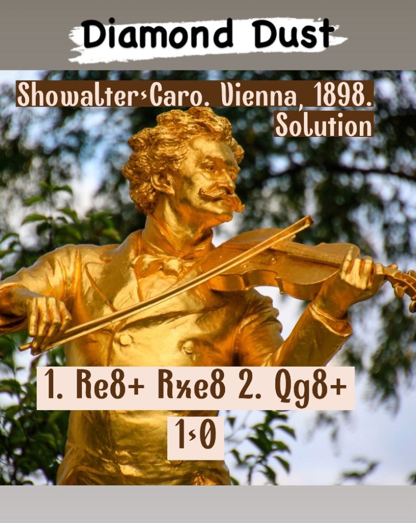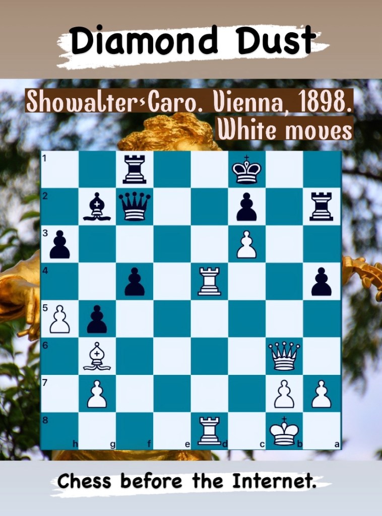 Diamond Dust Posted byformermailmanDecember 21, 2023December 21, 2023Posted inTacticsTags:Chess combinations, Chess problems, Chess tactics, Tactics Share this: Click to share on X (Opens in new window) X Click to share on Facebook (Opens in new window) Facebook Click to share on LinkedIn (Opens in new window) LinkedIn Like Loading... Related