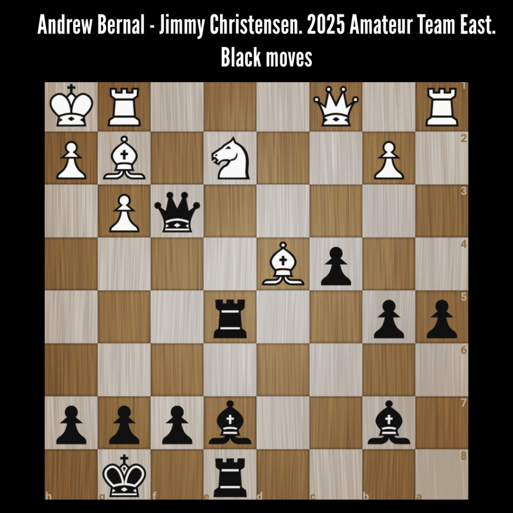 Tactics!!! Posted byformermailmanMarch 17, 2025Posted inTacticsTags:Chess combinations, Chess problems, Chess tactics A tactical blow by club member Jimmy Christensen at the recent Amateur Team East Tournament. Share this: Click to share on X (Opens in new window) X Click to share on Facebook (Opens in new window) Facebook Click to share on LinkedIn (Opens in new window) LinkedIn Like Loading... Related