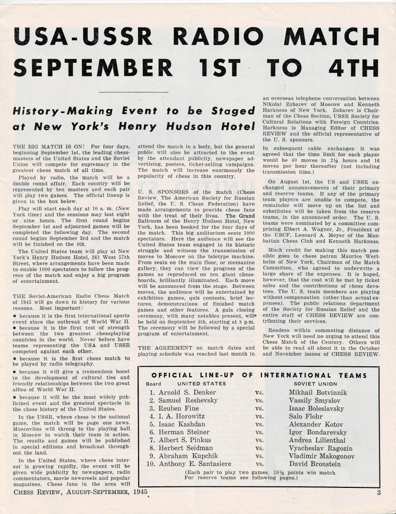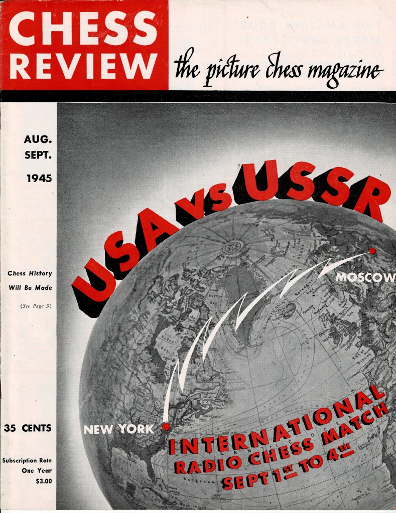 August/September 1945 Chess Review. World War 2 is drawing to it’s merciful end and the first post war event, the now famous Radio Match is announced.
