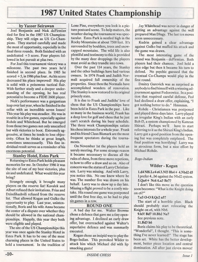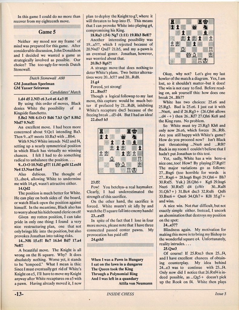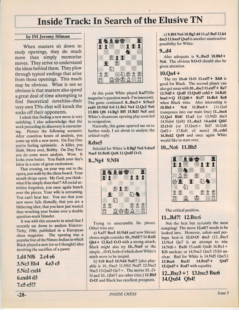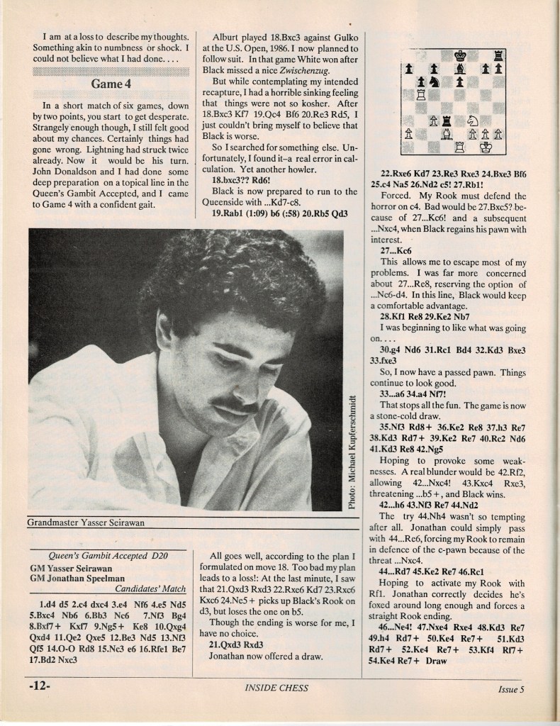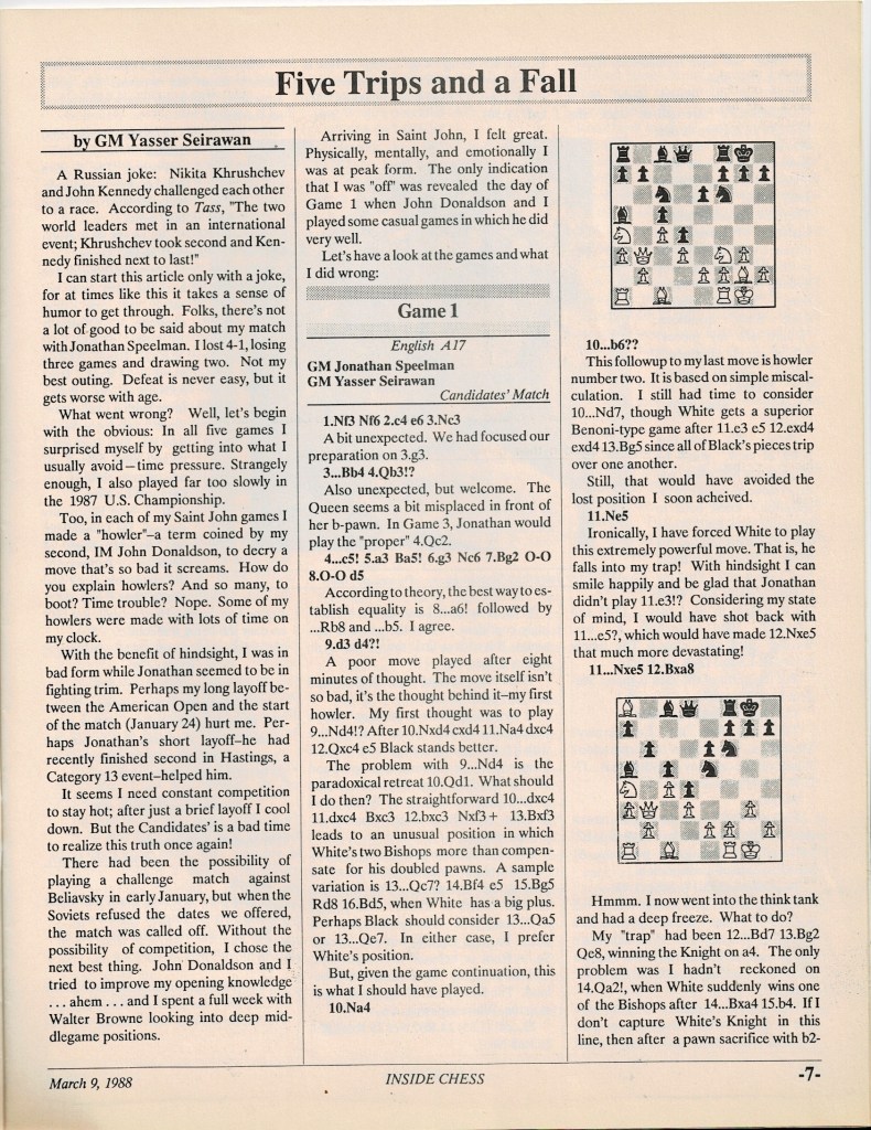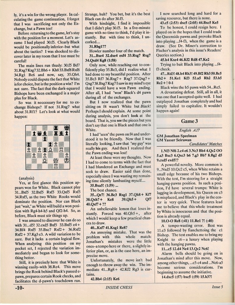Issue # 5 of Yasser Seirawan’s fine magazine Inside Chess. Featured are the Candidates match between Yasser Seirawan of the USA and Jonathan Speelman of England. Then an article on a theoretical novelty in the Nimzo-Indian.
