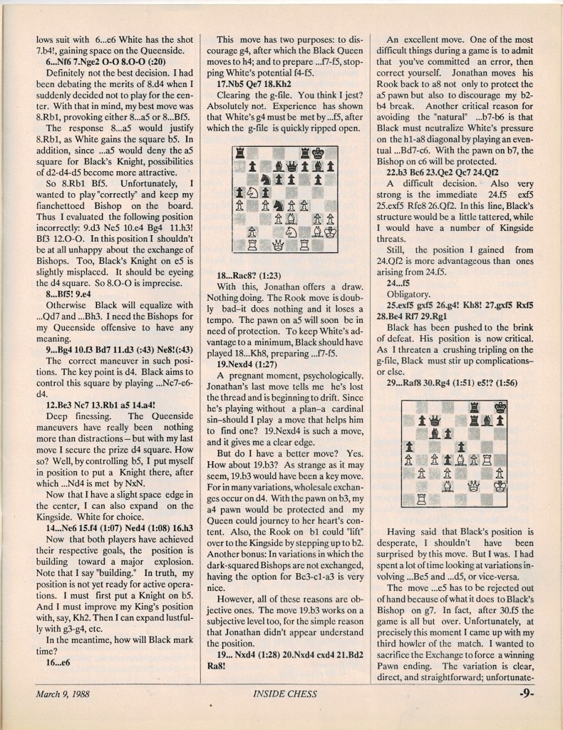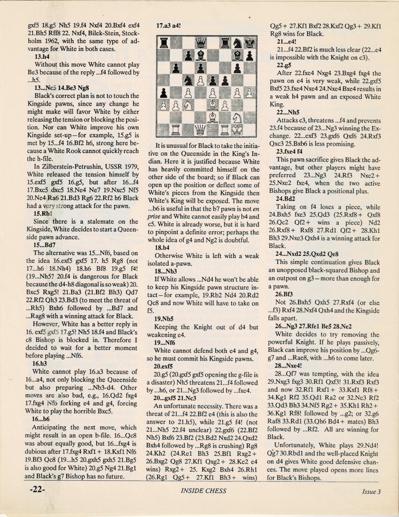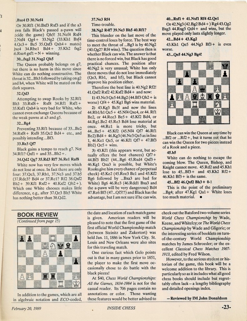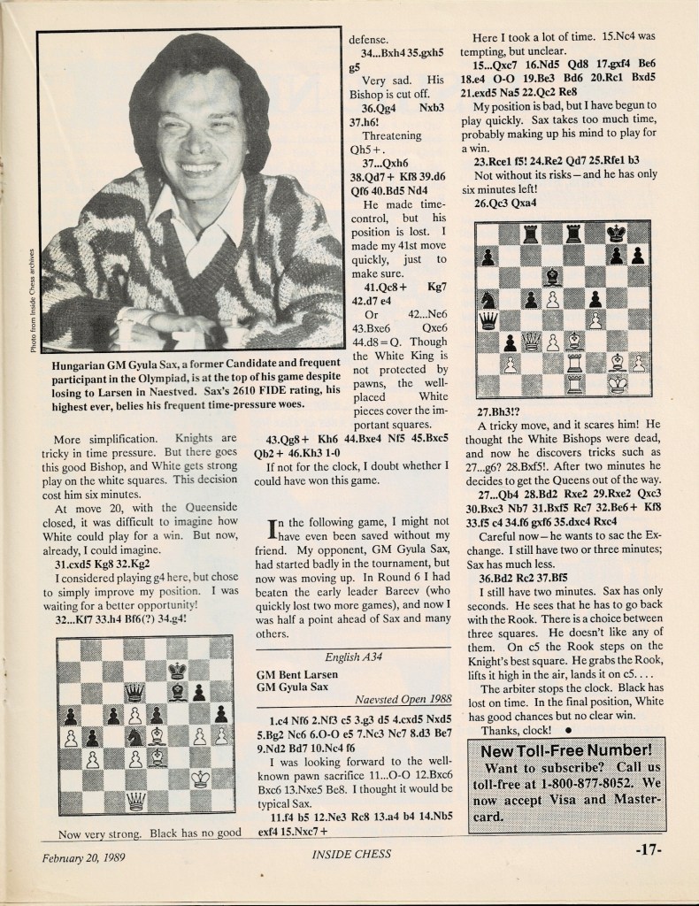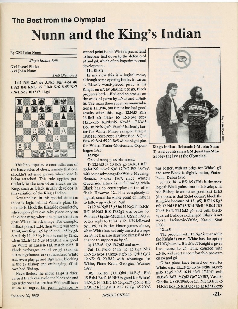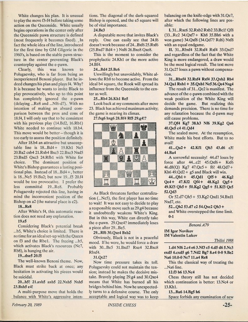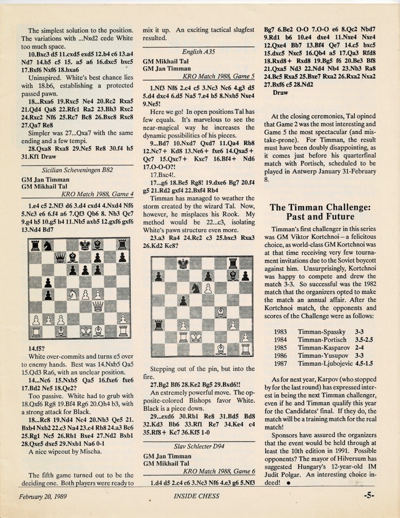 Annotated games and Opening/Endgame instructional articles by Masters of the past! Inside Chess from February of 1989.
