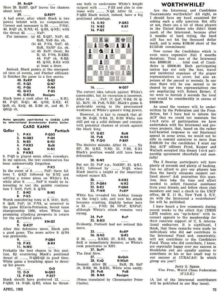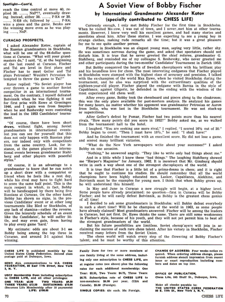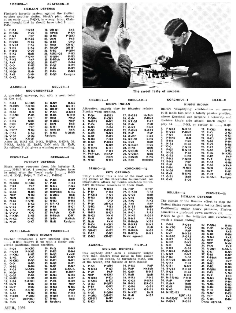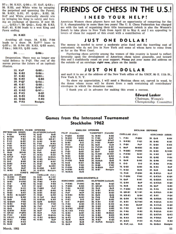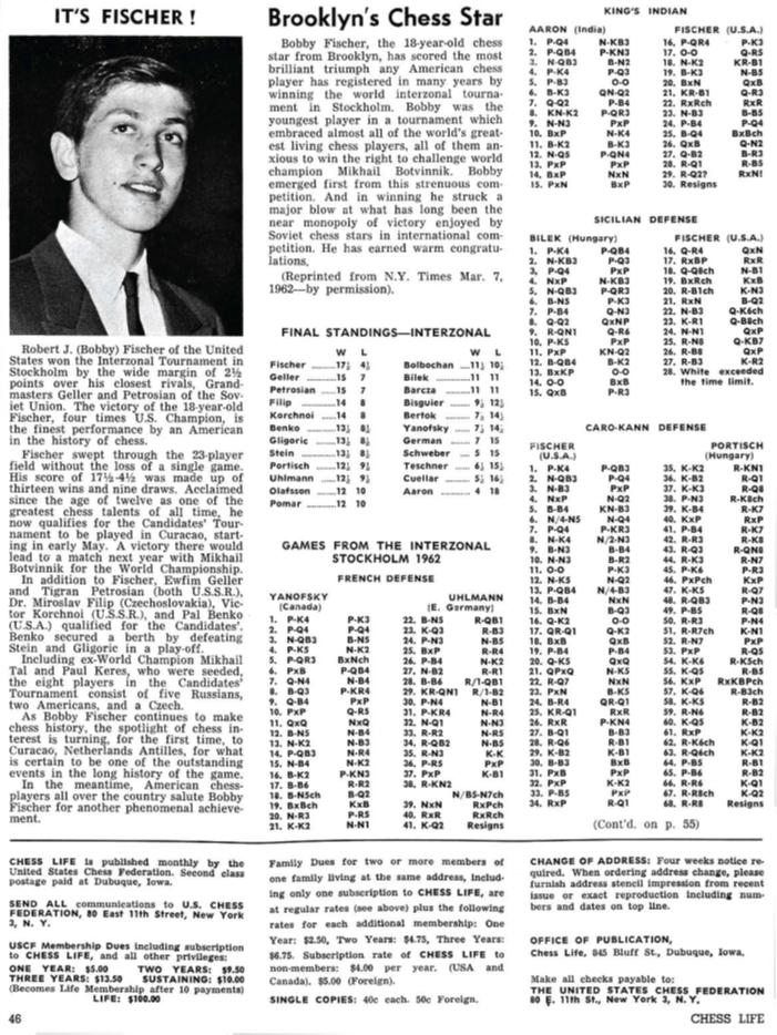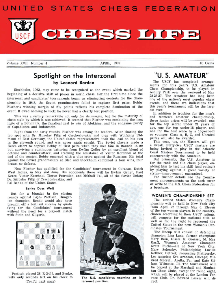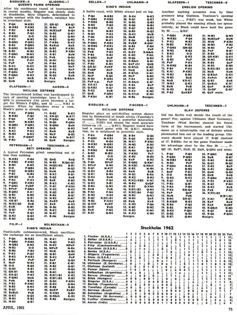 The March and April editions of Chess Life featuring the coverage of Bobby Fischer’s’ famous Interzonal win in Stockholm, Sweden in 1962. Fischer continues to establish himself as one of the Best on the Planet by accruing a final score of 17.5-4.5 without a single loss. In addition to that he maintained his plus score against the Russians which he achieved at Bled in 1961.